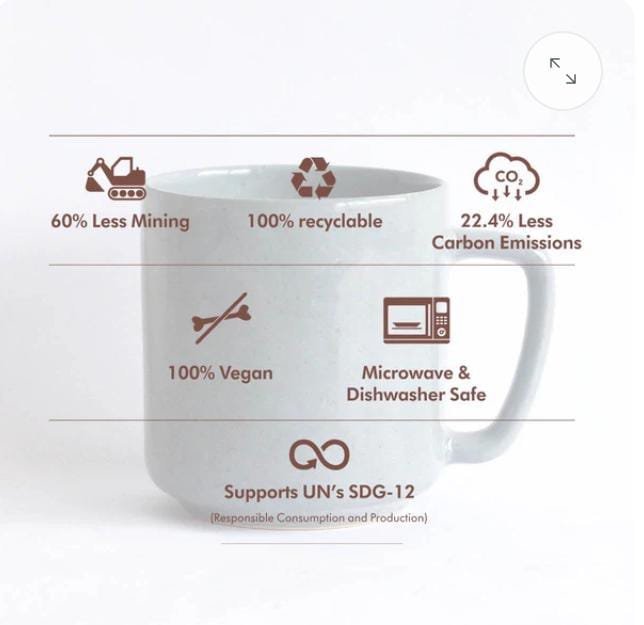 Sustainability Factor: Reduces mining of natural resources by 60%. Has 22.4% lower emissions than conventional ceramics. 100% plastic-free packaging made from recycled paper.