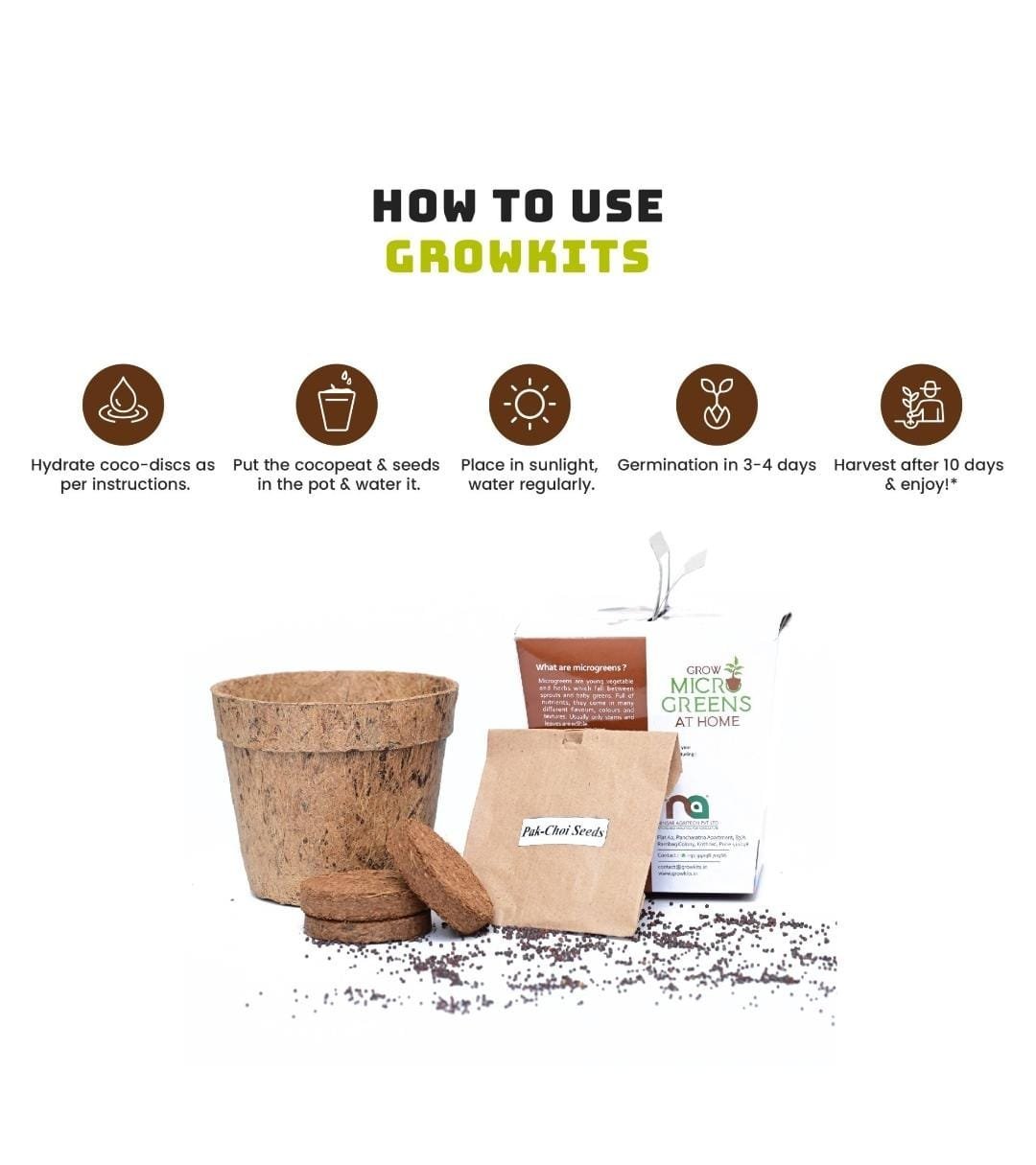 Our home gardening grow kit has everything you need to start growing microgreens from seeds, in your kitchen garden. Inside the kit, you’ll find Compressed 3 Coco Peat discs, Packet of seeds, and 1 small coir pot. Additionally, there’s a comprehensive gardening guide for growing microgreens.