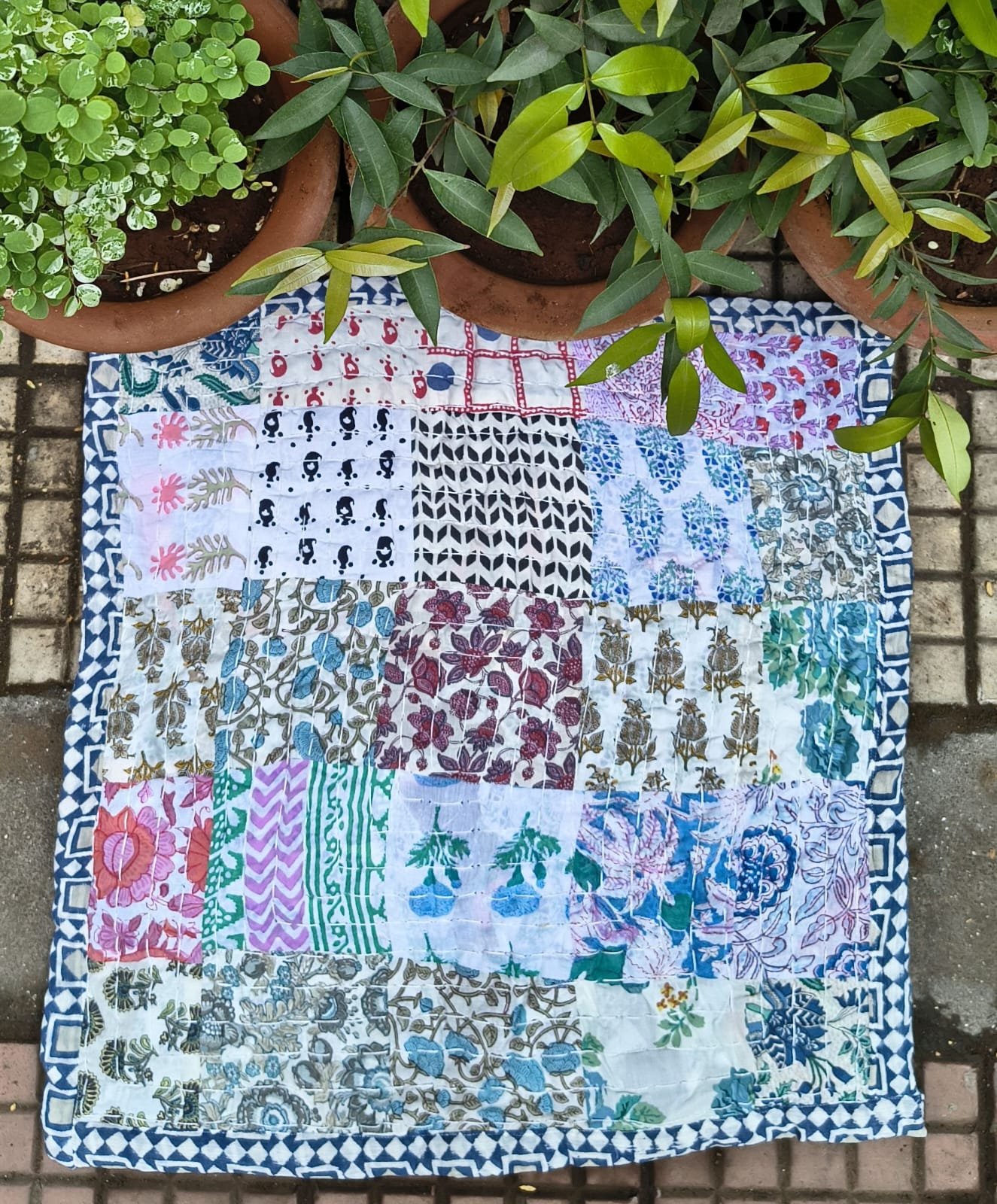 Meditation mats made out of upcycled fabric and is machine stitched / semi-handstitched.
