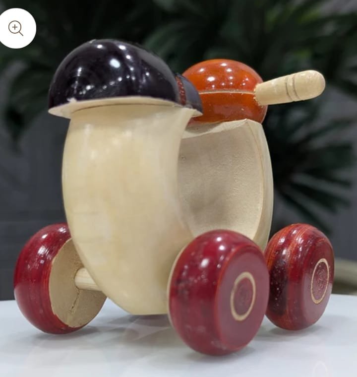 A brightly colored cute scooter toy with wooden wheels with organic lacquer based colors.