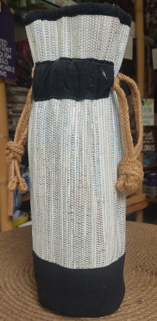 Product Details: reCharkha’s UPCYCLED-HANDWOVEN fabric made from waste plastic on the outside with cotton fabric as inner lining. Jute strings are used for its closure and canvas fabric at the base will give the required cushioning for that glass bottle inside!