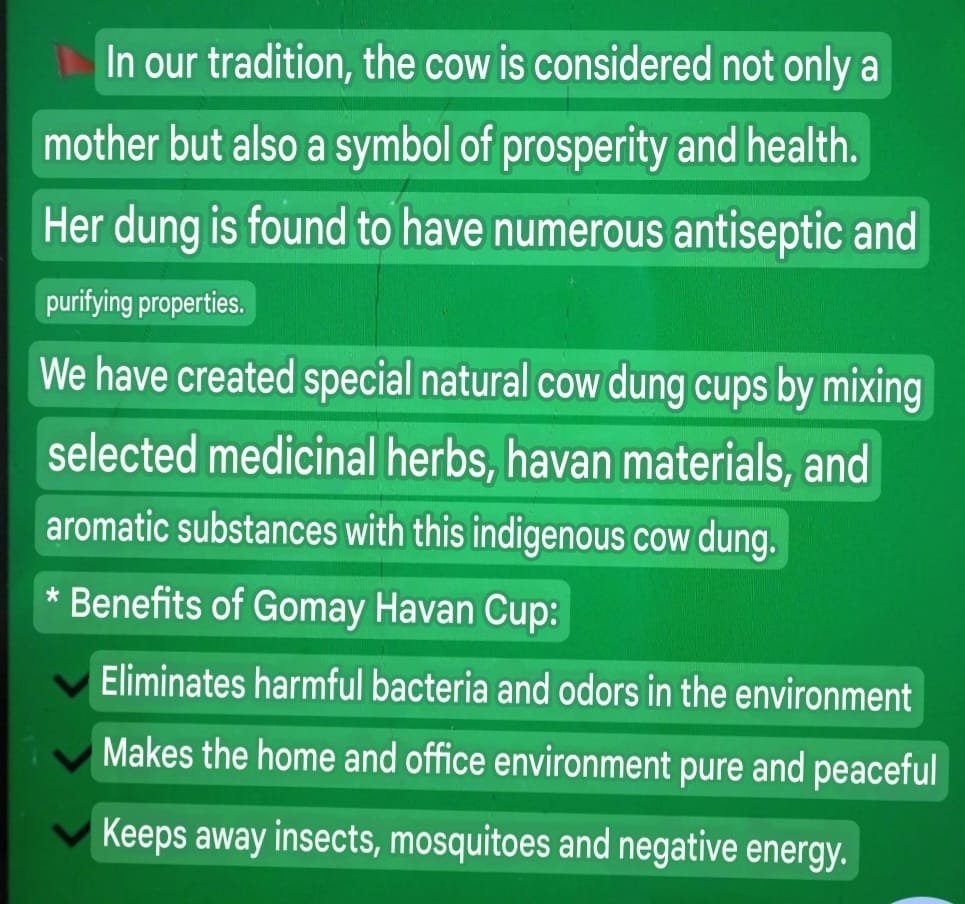 We have created special natural cow dung cups by mixing selected medicinal herbs ,havan material , and aromatic substances with this indigenouscow dung.