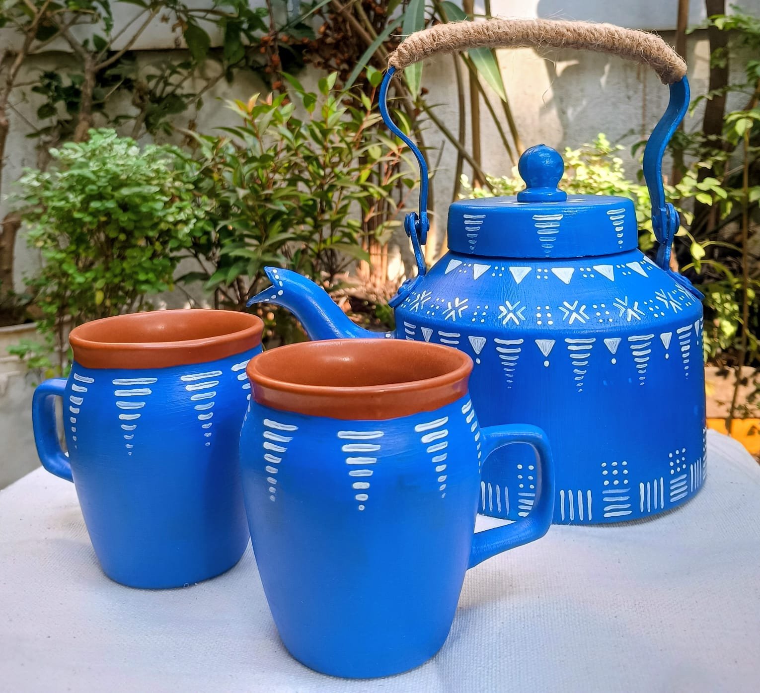This unique tea set combines the rugged durability of an industrial aluminum kettle with the earthy, health-conscious charm of traditional terracotta cups. It is the perfect blend of modern utility and ancient heritage, ideal for serving chai, coffee, or herbal infusions.